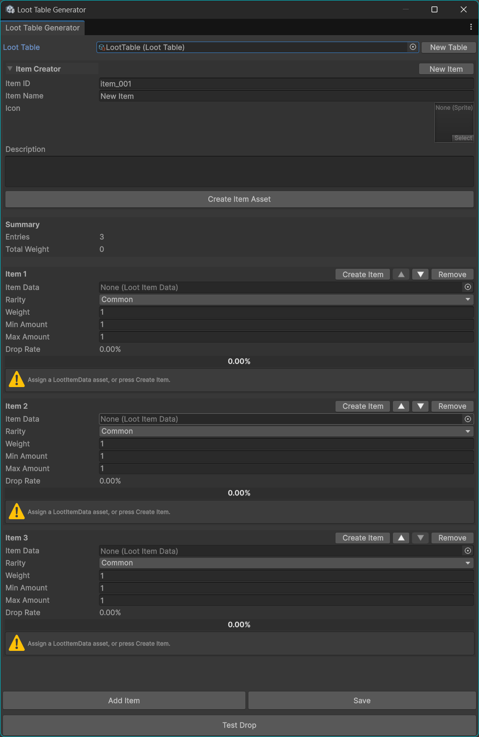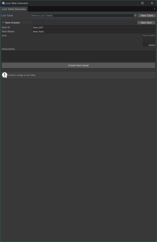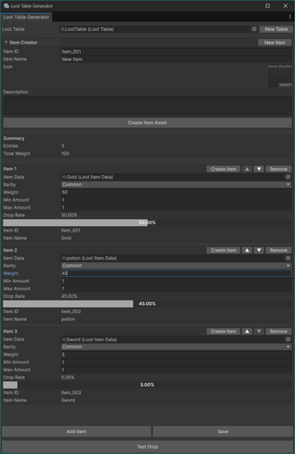 Loot Table Generator is a simple and practical Unity editor tool for creating and managing loot tables with a clean workflow.