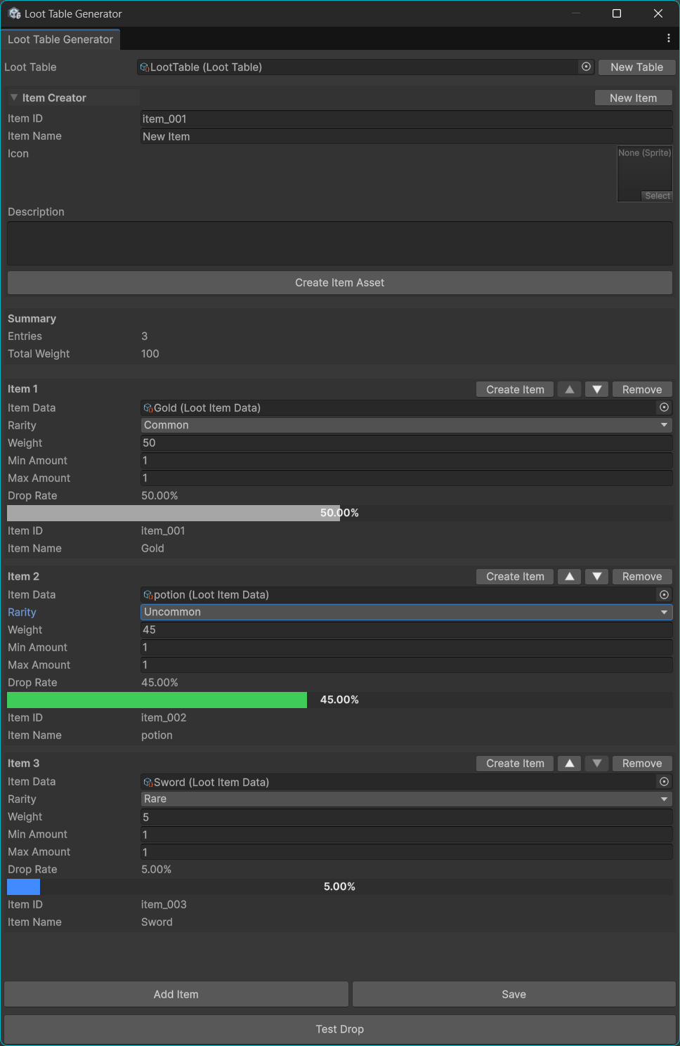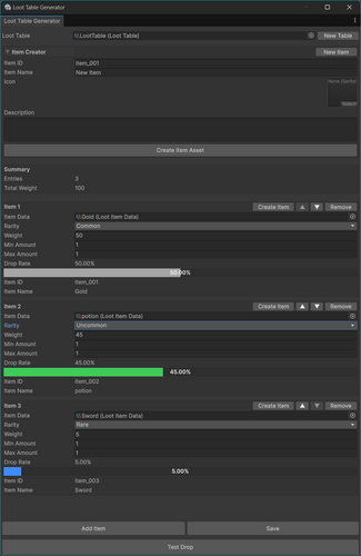 You can create both loot tables and loot items directly from the tool, assign rarity, adjust weighted drop chances, set min/max drop amounts, and preview probabilities visually with built-in percentage bars.