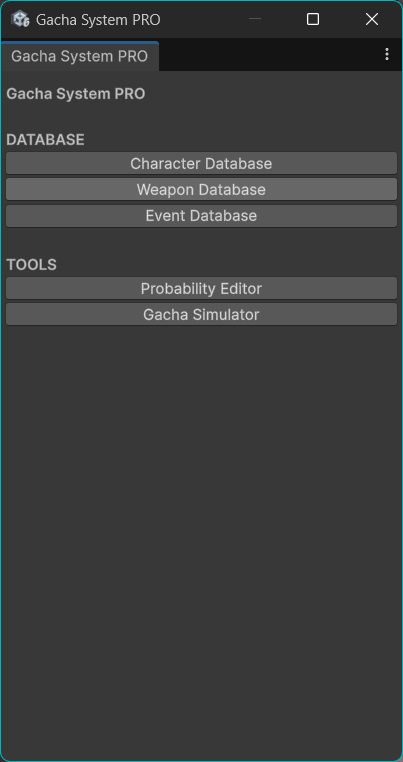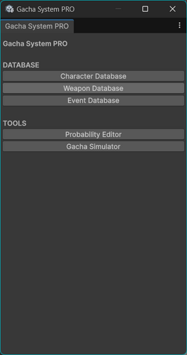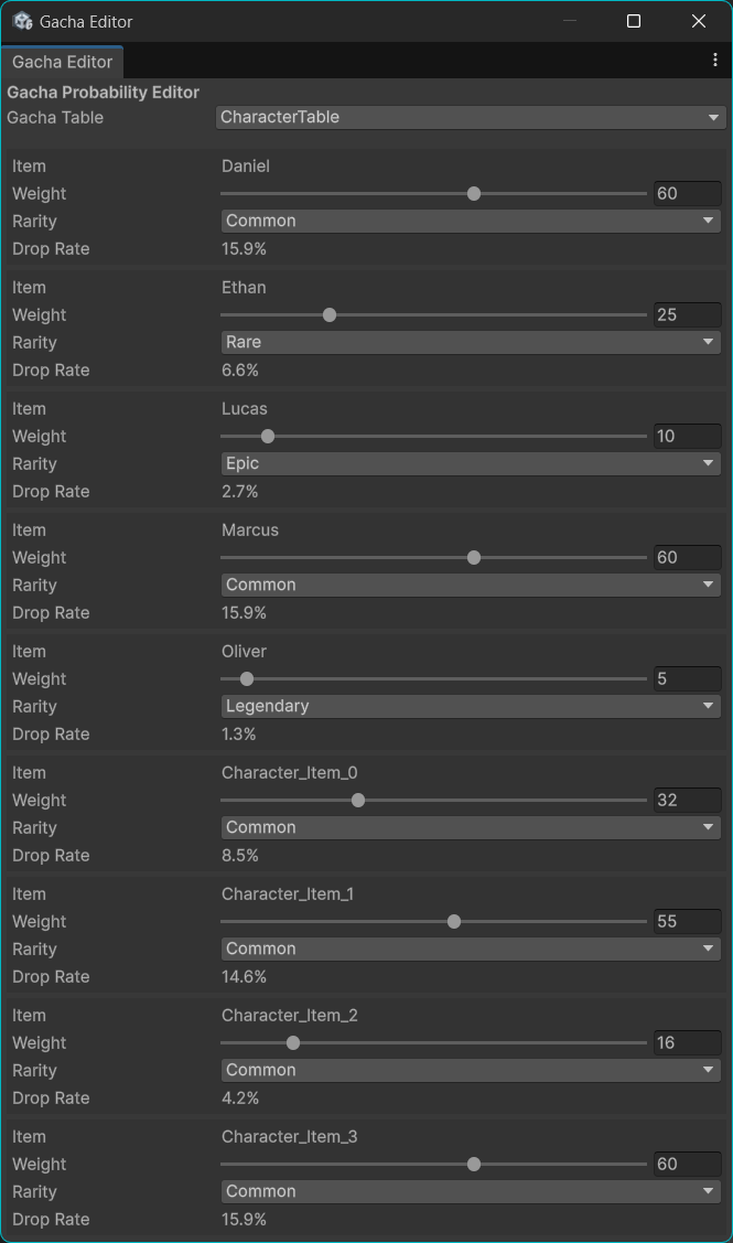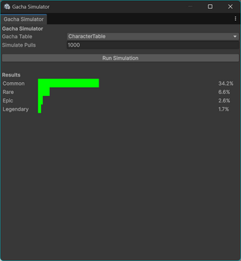 This package provides a fully functional gacha system including draw mechanics, probability editors, simulation tools, and ScriptableObject databases.